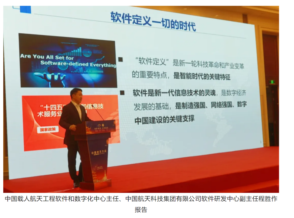 中國載人航天工程軟件和數字化中心主任、中國航天科技集團有限公司軟件研發中心副主任程勝作題為《構建航天軟件研制新體系——打造航天軟件新質生產力》的報告。闡述了國內外軟件行業發展概況以及我國航天軟件面臨的嚴峻形勢和挑戰,提出了建立智能時代航天軟件研制新體系的戰略規劃和體系規劃。