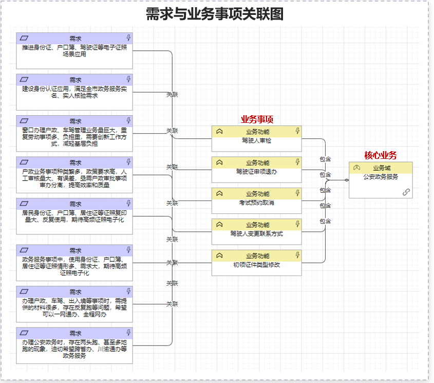 需求與業(yè)務(wù)事項關(guān)聯(lián):通過工具將重大需求關(guān)聯(lián)到核心業(yè)務(wù)及業(yè)務(wù)事項。定準(zhǔn)核心業(yè)務(wù)是“V”模型應(yīng)用的起點,從需求出發(fā),謀劃多跨場景的第一步就是要找到場景所在的核心業(yè)務(wù)和事項,自此開始對業(yè)務(wù)進(jìn)行多跨場景的拆解和集成。