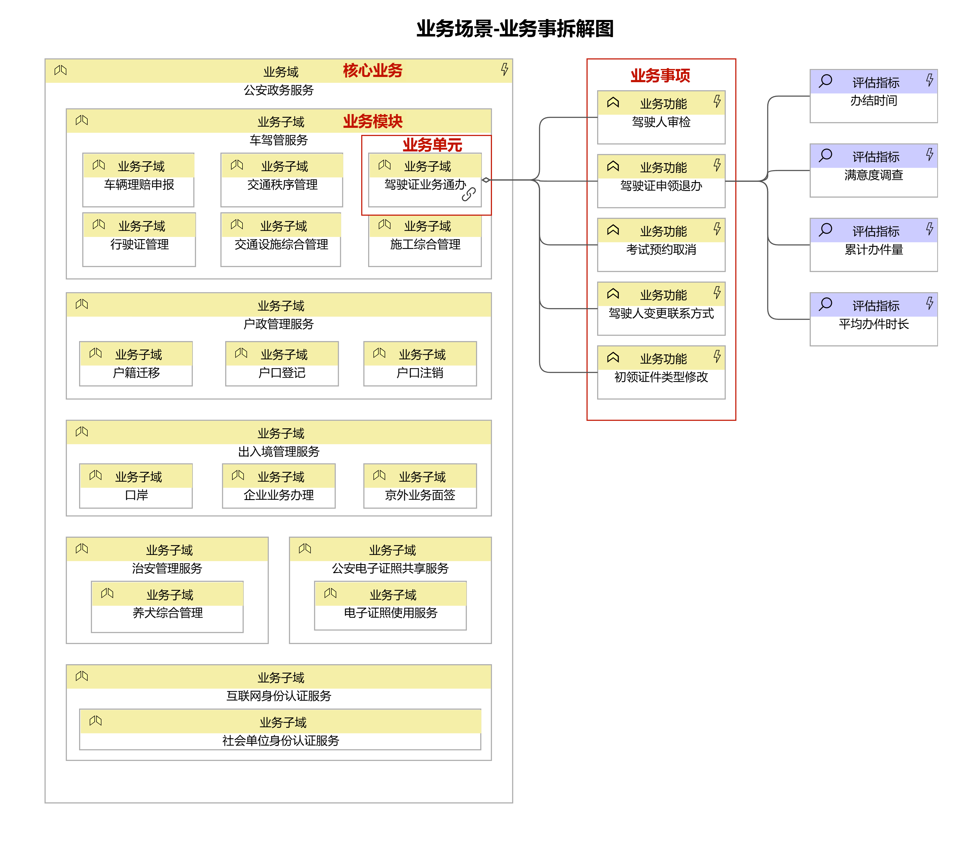業(yè)務(wù)場景與事項拆解:從“大場景”中尋找“小切口”,對核心業(yè)務(wù)逐層拆解出業(yè)務(wù)場景、業(yè)務(wù)單元,直至最小級別的業(yè)務(wù)事項。最小級別的業(yè)務(wù)事項可以理解為單個部門履職具體化的最小單元,它關(guān)聯(lián)了主責(zé)部門、使用的數(shù)據(jù)等要素。對多個業(yè)務(wù)事項編排,形成解決特定業(yè)務(wù)需求的流程。因此,謀劃多跨協(xié)同場景需要將業(yè)務(wù)拆解到最小級別的業(yè)務(wù)事項才能滿足要求。