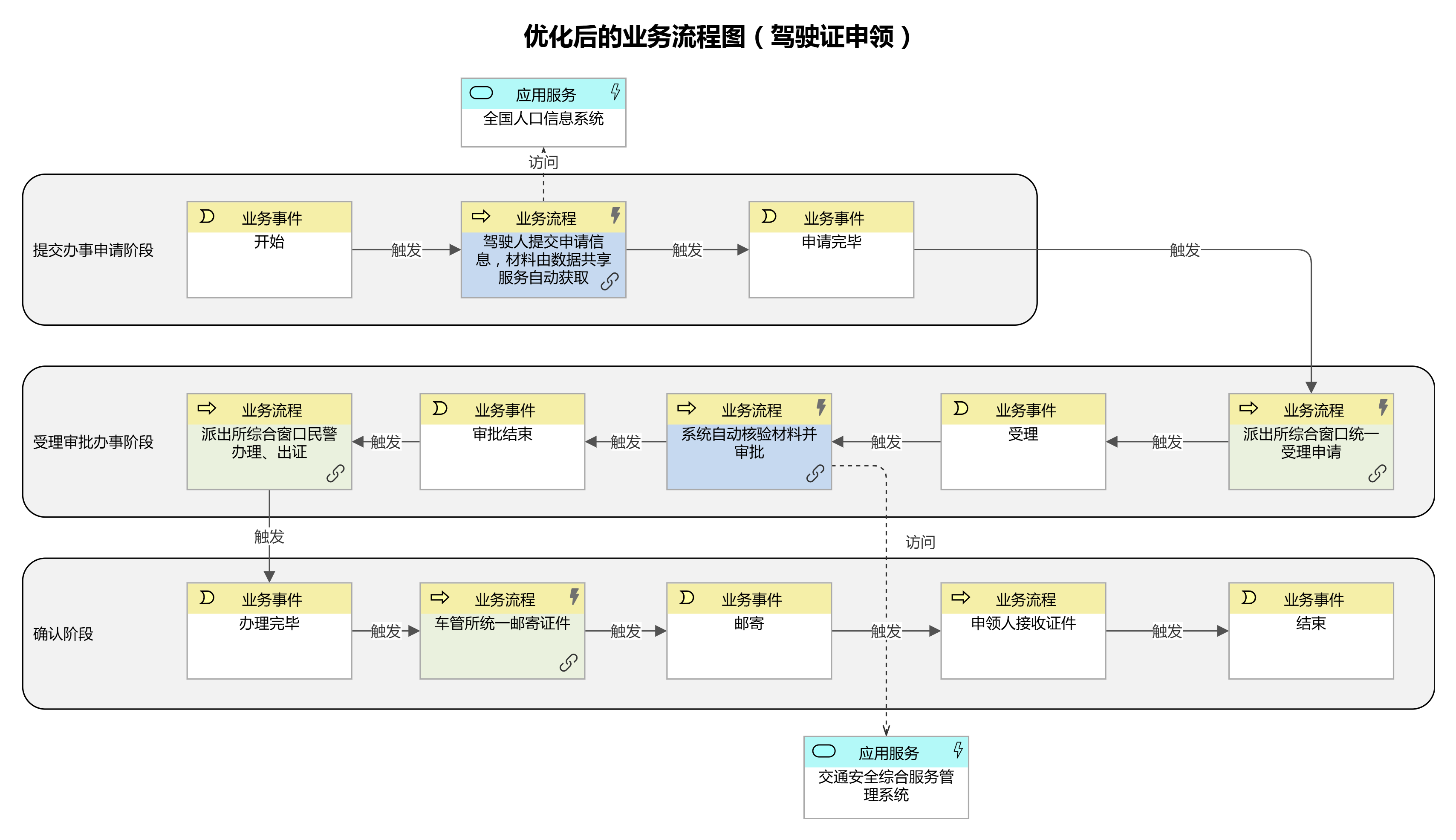 優(yōu)化業(yè)務(wù)流程:謀劃好可集成的數(shù)據(jù)、可協(xié)同的部門后即完成了多跨場景的集成過程。集成后形成的新流程活動替換現(xiàn)行活動,實現(xiàn)流程的再造。再造流程將解決重大需求中描述的“堵點”、“卡點”問題,因此新流程中的創(chuàng)新活動、智能活動就是需要改革的項目。