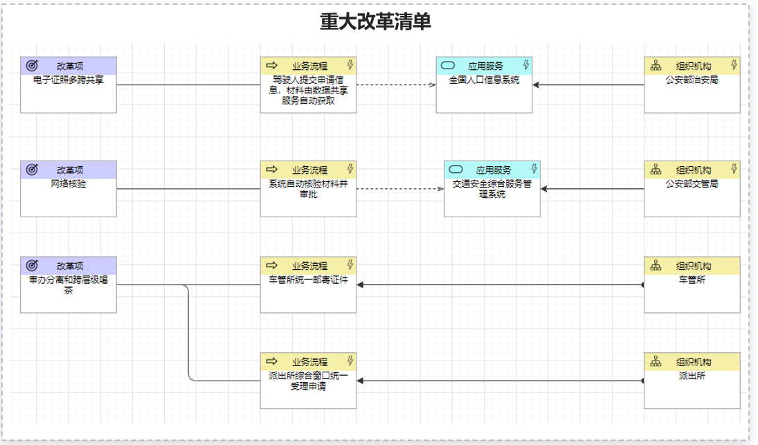 將再造流程中的創(chuàng)新點關(guān)聯(lián)到涉及的應(yīng)用系統(tǒng)以及主管部門,即可形成完整的改革項,最終作為梳理重大改革清單的素材。