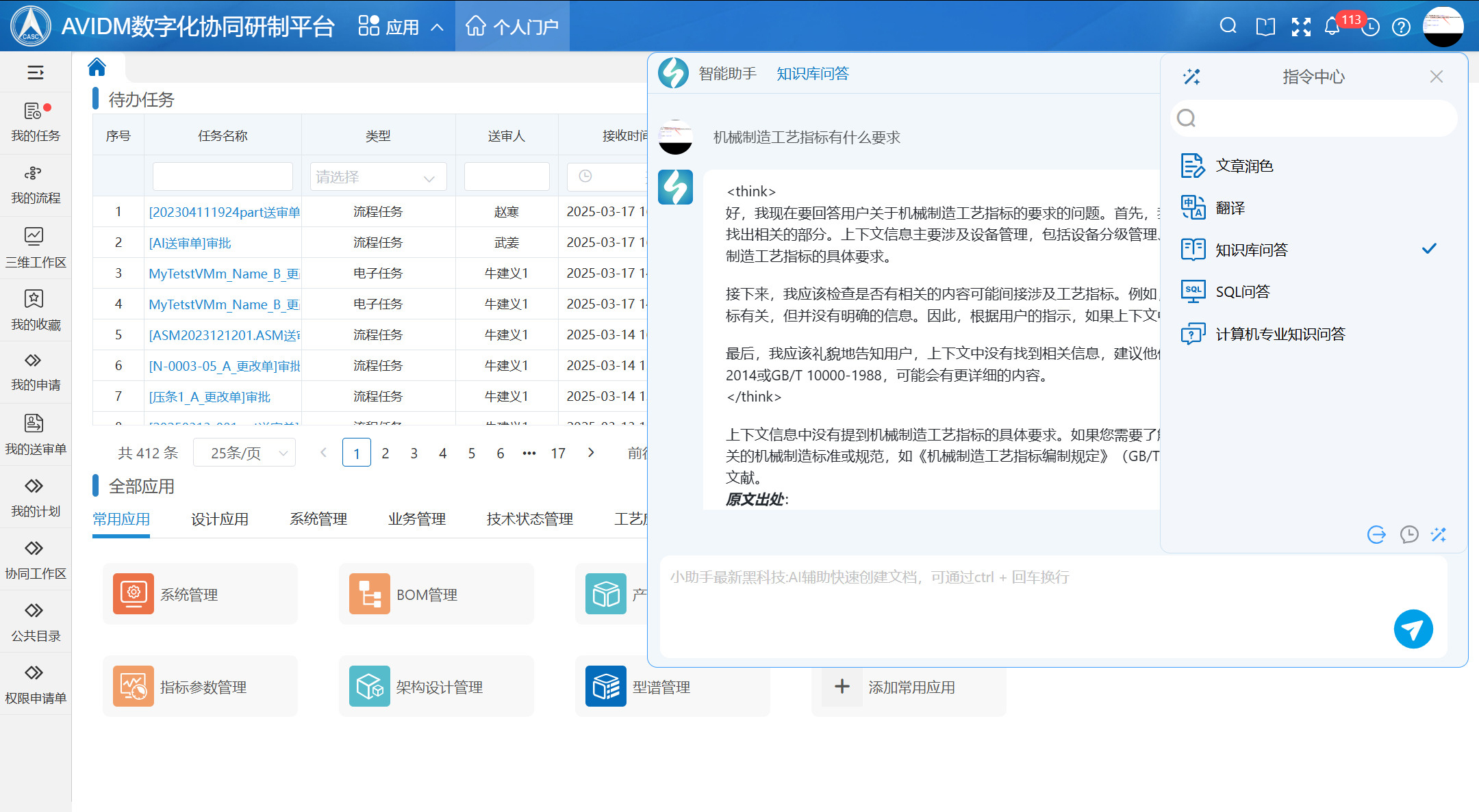 AVPLM系統已具備科研生產智能問答、文檔智能生成、文檔智能審查、工藝智能生成等智能化場景應用能力。