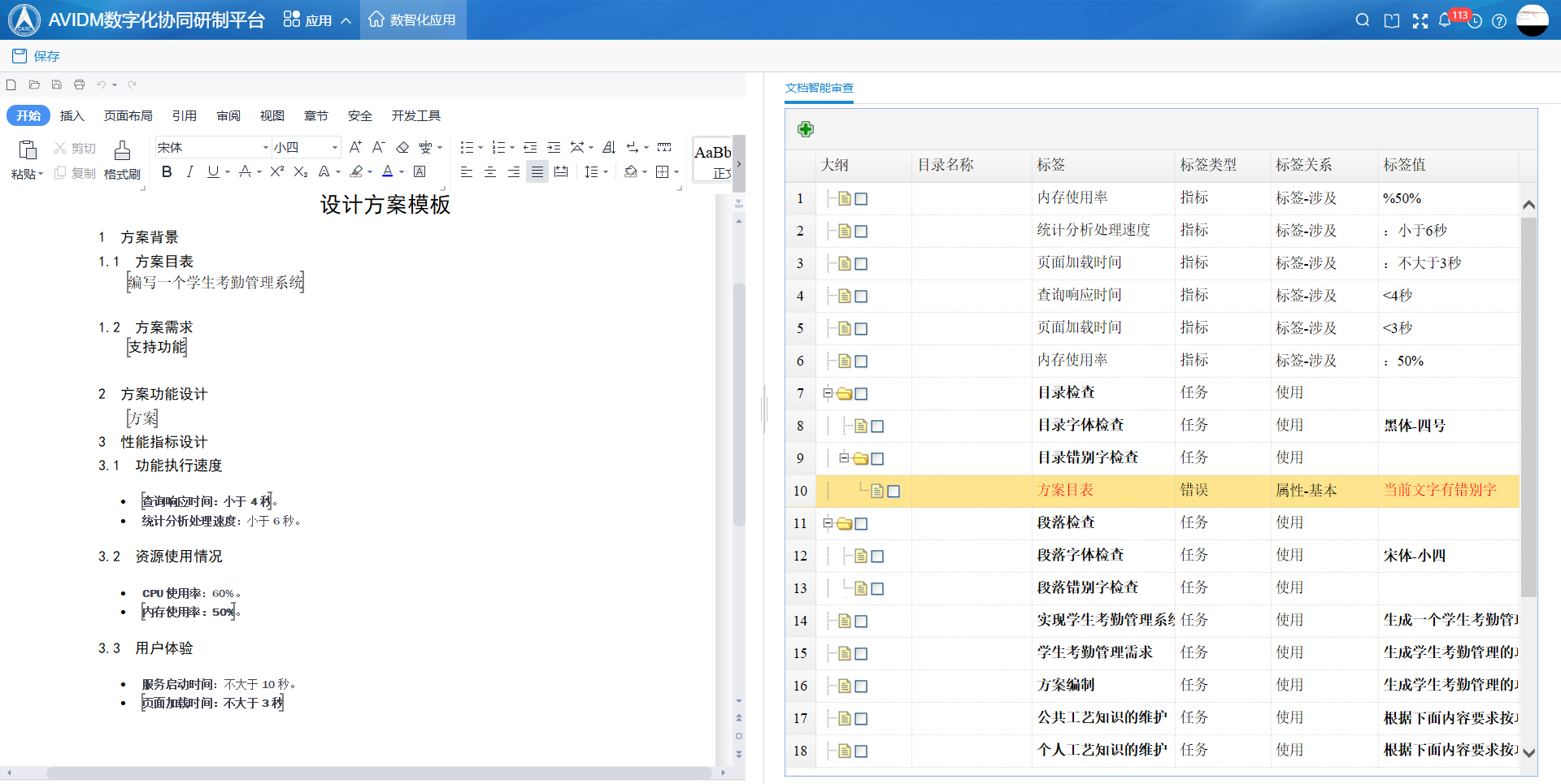 調用DeepSeek大模型的指標抽取與分析能力, 通過在系統中內置合規性規則庫(如結構設計文件檢查規則、工藝設計文件檢查規則等),以及各種文檔模板的格式規范性要求,自動檢查文檔的格式規范性、內容完整性和邏輯矛盾,支持多文件關聯審核。